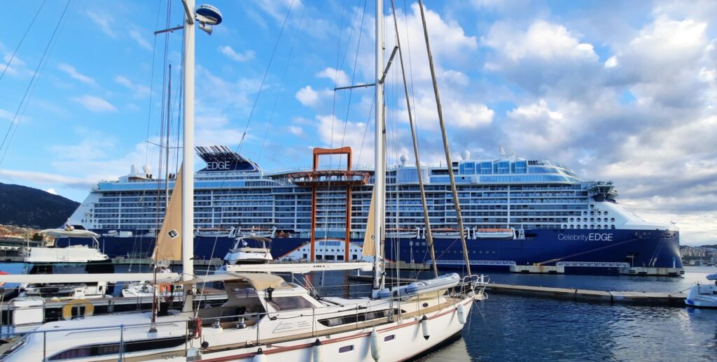 So entschieden wir aus Vernunftsgründen von Ajaccio wieder die Küste hinunter zu segeln. Um sieben Uhr weckten uns dumpfe Motorgeräusche, die eigentlich nur von Fähren oder ähnlichem herrühren konnten. Und tatsächlich: Keine hundert Meter neben uns, hatte das Luxus-Kreuzfahrtschiff, die Celebrity Edge, mit einem Fassungsvermögen von 2000 Passagieren und 1700 Leuten Besatzung, angelegt.