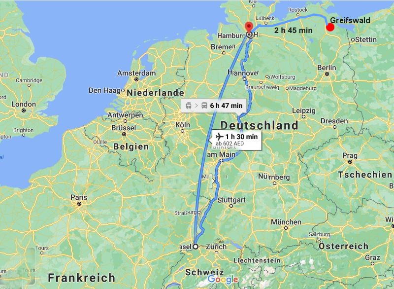 Viele Wege führen nach Greifswald. Edi wollte die deutsche Landschaft an sich vorbeiziehen lassen und nahm den ICE nach Hamburg, Claudia setzte sich in den Flieger, aber sie trafen sich nach einigen Irrungen (Bahnhöfe gibt es in Hamburg einige) und kamen am Samstagabend mit dem Mietwagen in Greifswald an.