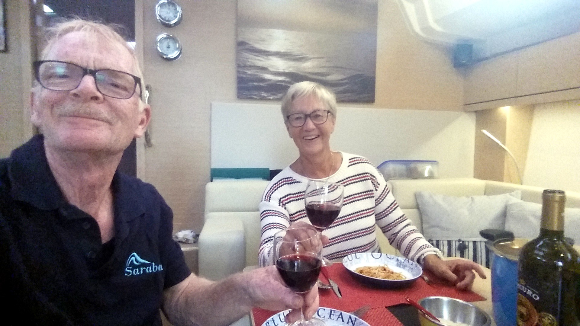 Und dann wurde geschraubt, montiert und sortiert. Eine Yacht hat tausend Kästen und Stauräume, die alle zweckbringend genutzt werden wollen – eine logistische Herausforderung. Nach ein paar Tagen sah es im Salon schon ganz heimelig aus. Regi hatte ihre Küche schon sehr gut eingerichtet und wir konnten anstossen und und unser erstes Nachtessen an Bord begiessen. Die Stimmung war euphorisch – wie man sich gut vorstellen kann – und der Wein aus dem Aldi (!) gar nicht so schlecht.