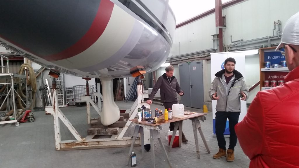 Am Samstag konnten alle künftigen Hanse-Eigner an einem ganztägigen Seminar mit Werftbesuch und verschiedenen Workshops über Motorenkunde, Segeltrimm, Riggkunde, Bootspflege und Elektronik teilnehmen. Es gab viel Neues zu erfahren. So wissen wir jetzt zum Beispiel, dass eine mittlere Yacht in ungefähr 1300 Mannstunden gebaut wird und der Produktionstakt alle zehn Stunden ein Boot ausspuckt.