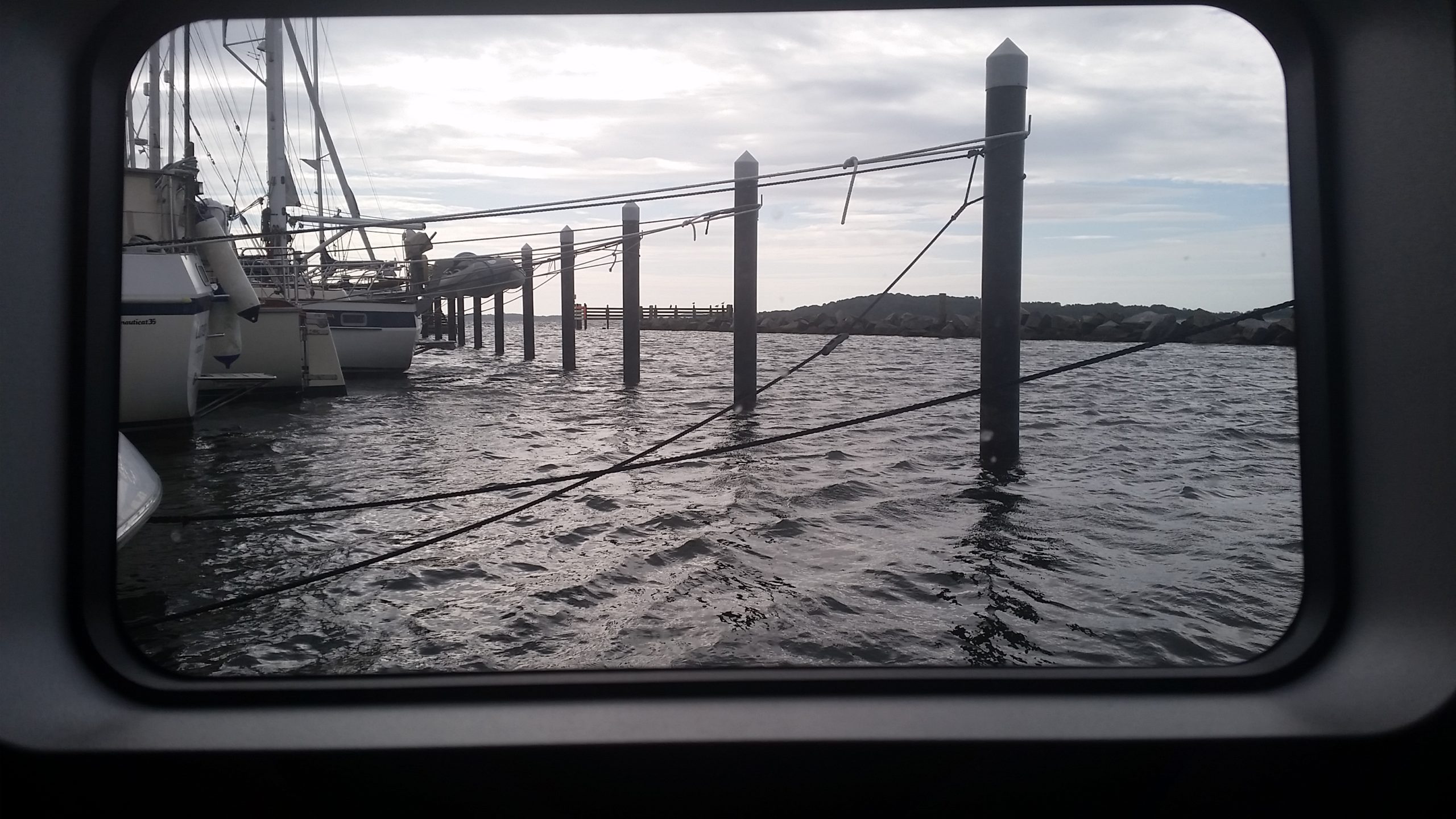 30.06. 2020 | Lauterbach-Rügen | Morgendliche Aussicht aus dem Kajütfenster: >Bild. No sailing today! Wind 25-30 kn West – Hafentag. |