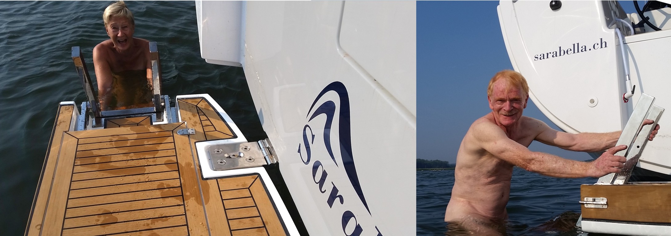 08.08. 2020 | Seedorf (Rügen) | Nach einem perfekten Segeltag und 20sm unter Segel ankern wir vor Seedorf und können das erste Mal die Badeplattform testen. (Wassertemperatur 22 Grad!) >Bild |