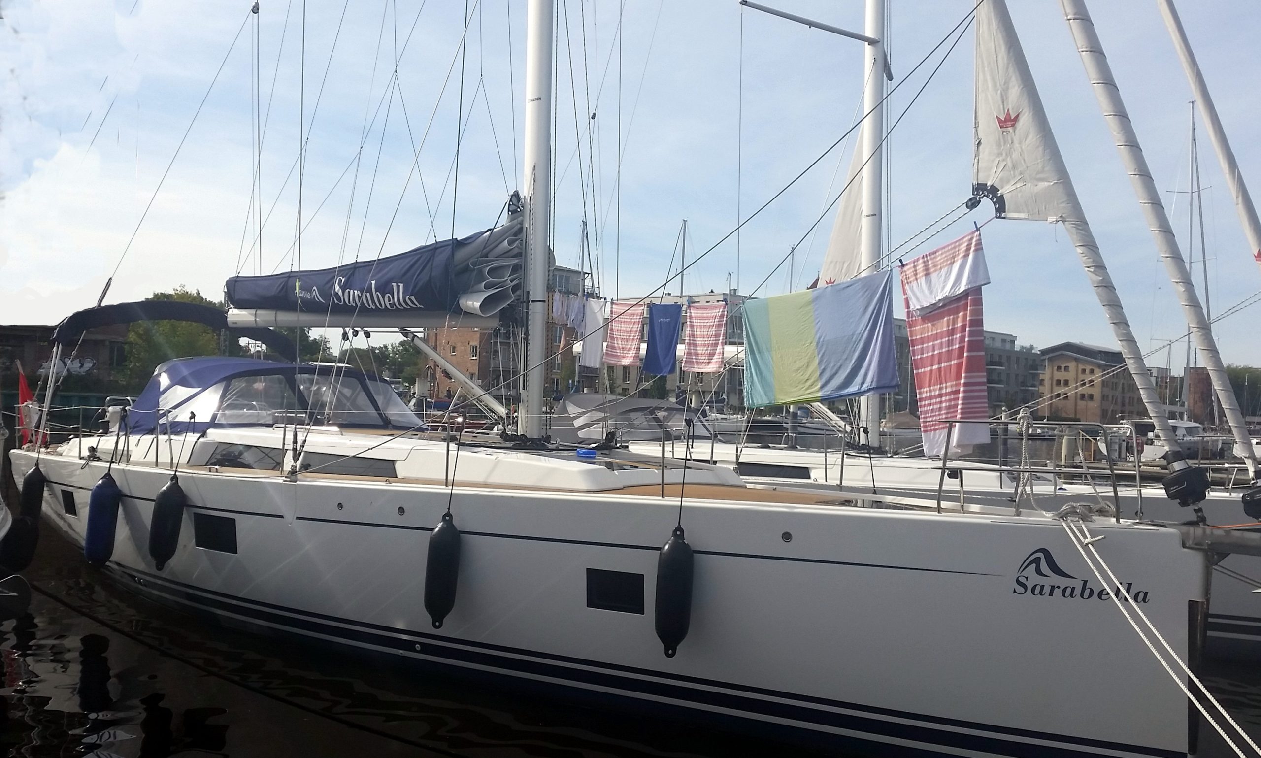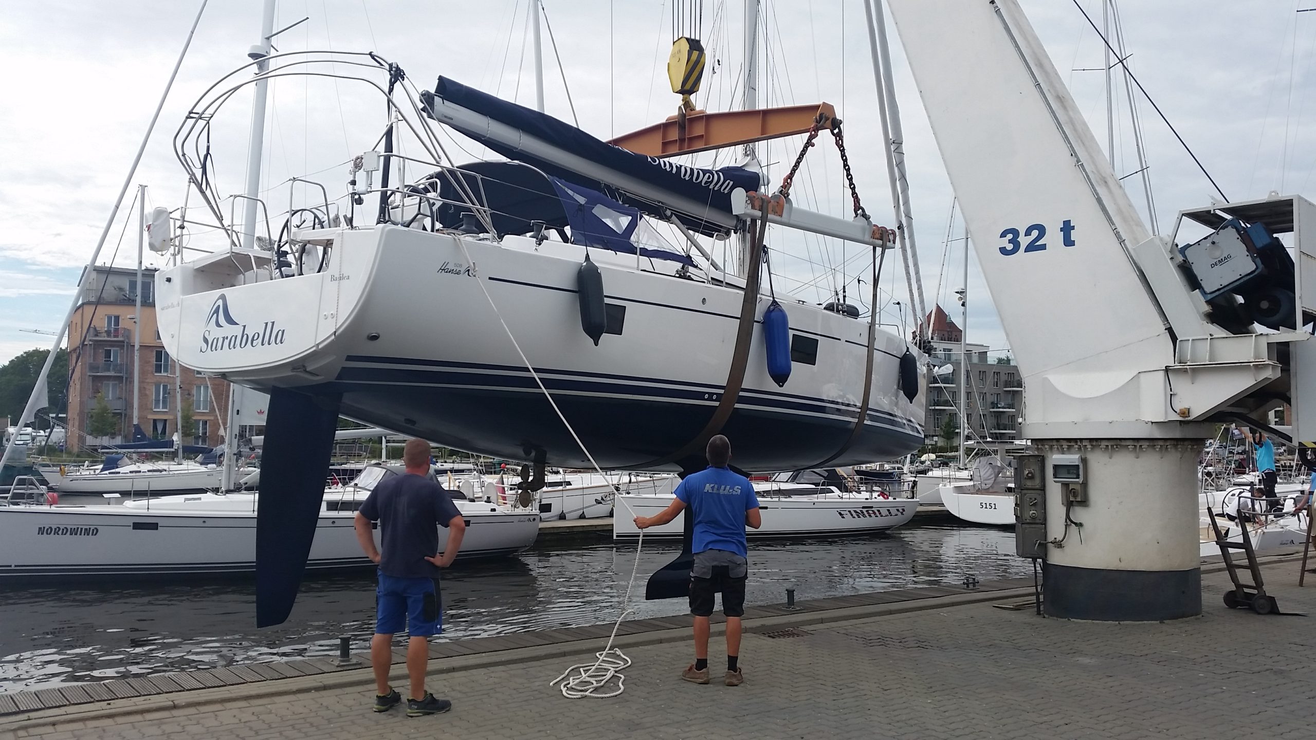 24.08. 2020 | Greifswald | Die Sarabella muss zum zweiten Mal an den Kran, (>Bild) da die Propellerleistung (Drehflügelprop von SPW ) immer noch nicht stimmt. Wir machen nur knapp 7.5 kn Fahrt bei 2400 RPM. Das ist für eine 50-Fuss Yacht definitiv zu wenig! Das Prozedere ist mühsam (Abbau Achterstag usw.) , da sie immer noch keinen Travellift haben. |