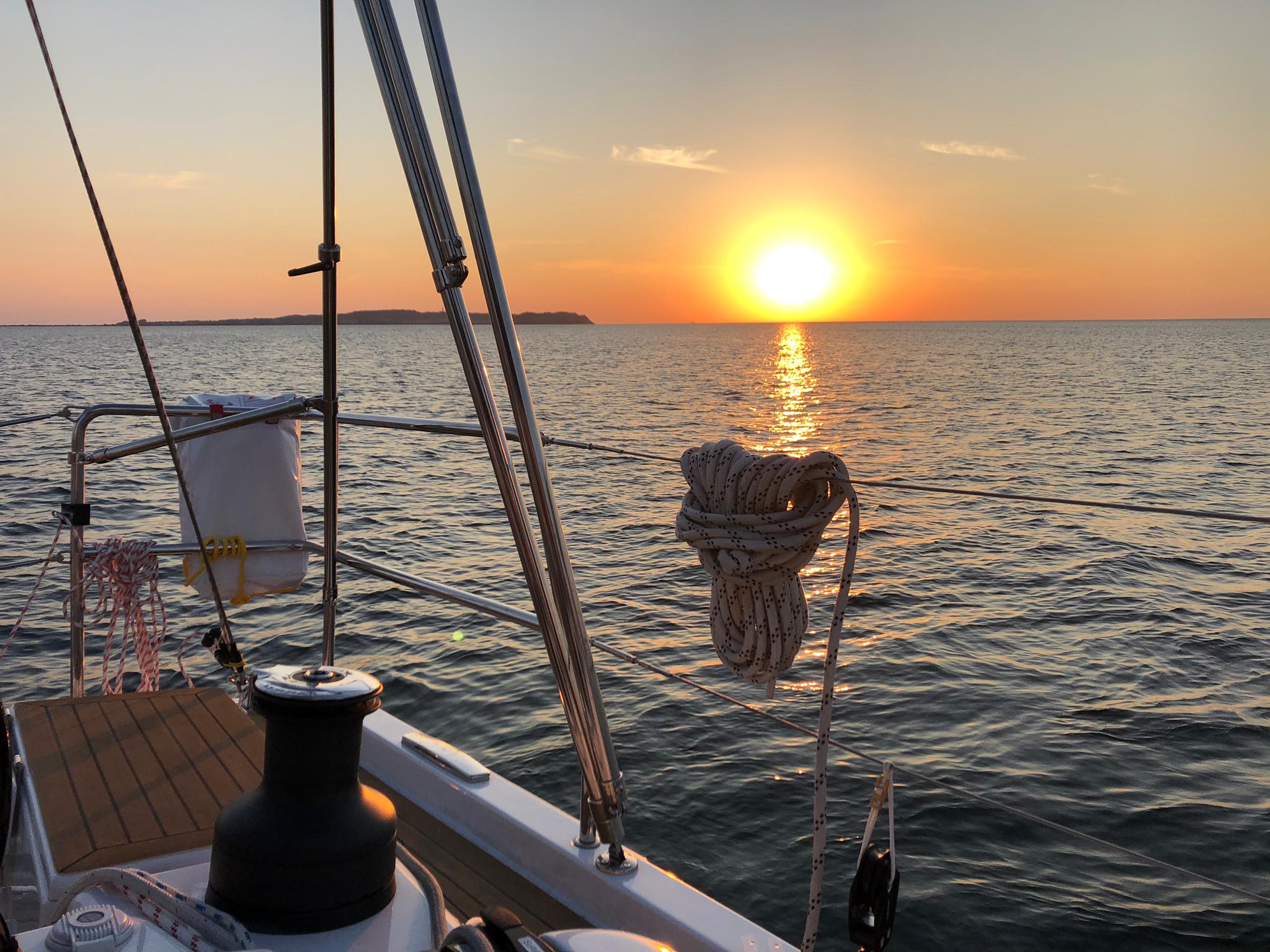 17.08.2020 | Hiddensee | Wir kommen nach 12 Std. (!) segeln bei wunderschönem Wind und 65 Meilen in Hiddensee an. Wir können gleich vor der Insel ankern und geniessen einmal mehr unsere tolle Bordküche. Natürlich dank den Kochkünsten von Regi und Alessandra! Der Sonnenuntergang mit 180 Grad Meersicht ist umwerfend! >Bild |