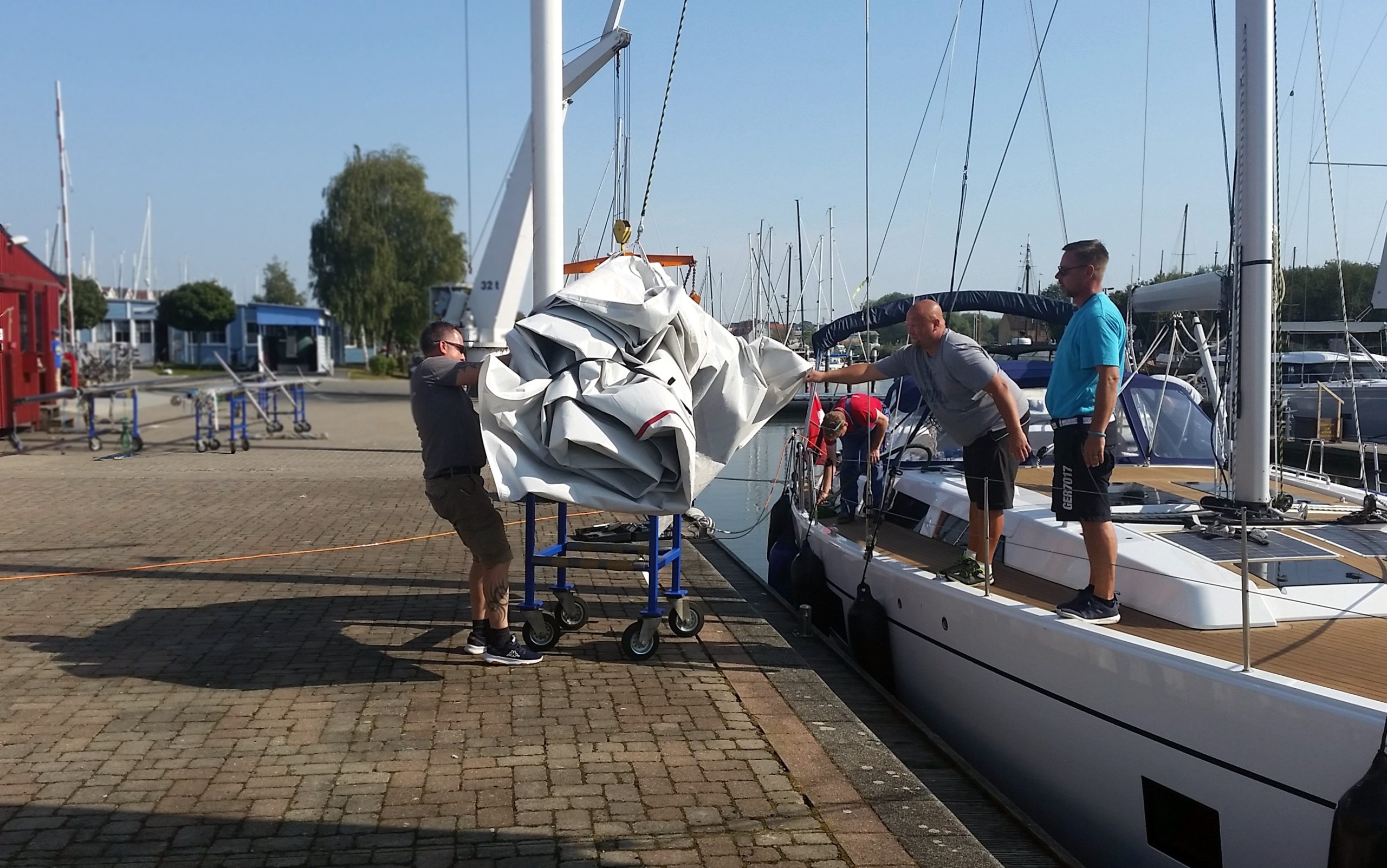 22.09. 2020 | Greifswald | Heute werden die Segel runter genommen. Schwerarbeit für die Jungs von Wendel & Rados: Der Reacher alleine wiegt ca. 85 kg! >Bild |