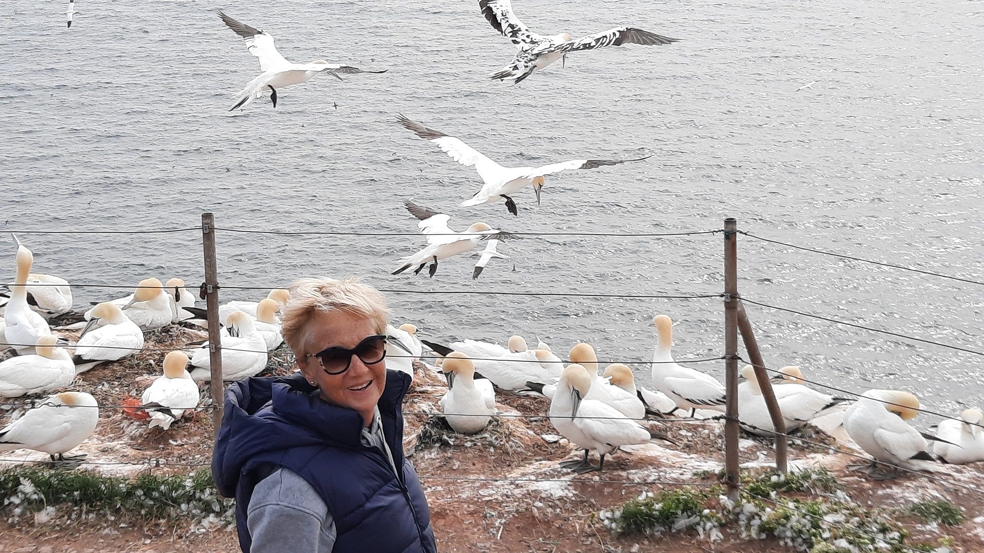 14.06.2021 | Helgoland | Es ist schon komisch, wenn man um 09.30 Uhr morgens schon angelegt hat. (>Bild Hafen-Helgoland). Da wir wegen der Tide schon um 05.00 Uhr die Elbe raus segeln mussten und dann mit Strom von bis zu 12 kn Fahrt über Grund (SOG) segelten, waren die 35 Seemeilen bis Helogland schon um zehn geschafft. Jens, unser Profiskipper für diese Woche (>Bild) gab uns wertvolle Tipps mit im relativ schmalen Fahrwasser und der Strömung umgeht. Den Nachmittag haben wir für eine Inselumwanderung genutzt und hautnah die Basstölpelkolonie beobachtet. (>Bild) |