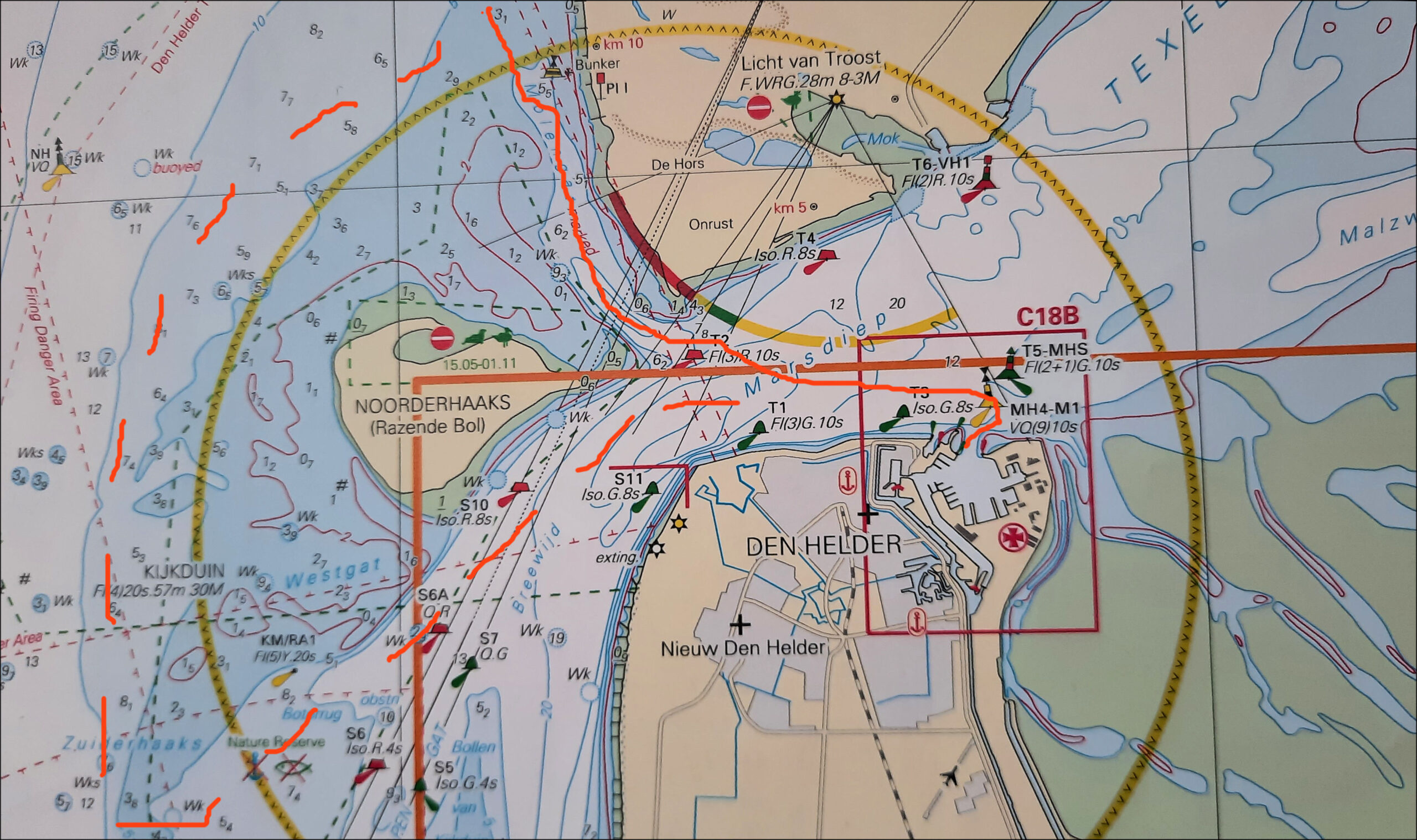 17.06.2021 | Den Helder | Wir ankern früh auf (07.00 Uhr) gegenüber der Hafenausfahrt von Vlieland um vom auslaufenden Tidenstrom zu profitieren. Es geht entlang von Vlieland und Texel, der letzten westfriesischen Insel, bevor wir nach Den Helder ins Gatt einfahren können. Wir wagen die Abkürzung durch das Mohlengatt (4.5-6 m Solltiefe, s. Track) und legen in der kleinen aber feinen Marina des Royal Navy Club an. (>Bild) Der Empfang durch den Hafenmesiter ist ausgesprochen herzlich! Der Törn ist mit 218 sm beendet, davon 120 sm gesegelt. >Bericht, Album |