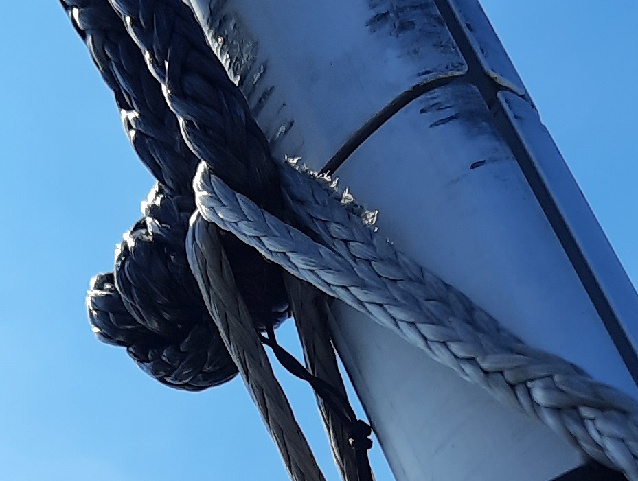 17.07.2021 | Marina du Château Brest | Die Sarabella ist dank Erikas und Reinis Hilfe in einem Tag aufgeräumt für die Sommerpause. Reini macht noch eine Riggkontrolle und steigt in den Mast. Der Dynemaschäkel des Reachers ist schon wieder leicht angegriffen, weil er konstruktionsbedingt am Vorstag streift. (>Bild) Hanse muss sich da was überlegen! |