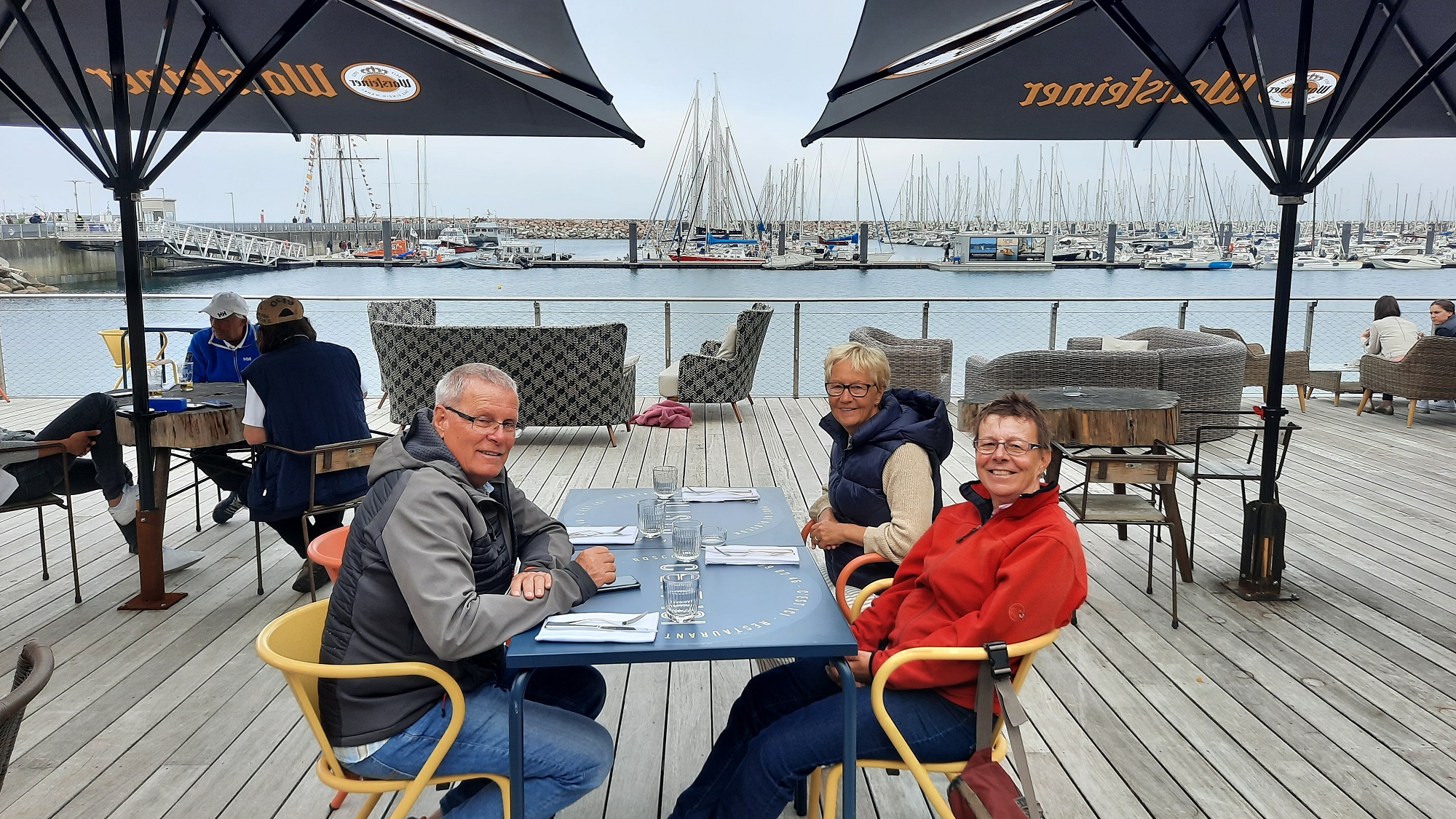 21.08.2021 | Pornichet | Es regnet heute nur einmal – dafür den ganzen Tag. Zum Glück hat es ab der zweiten Hälfte der Strecke (32m) genug Wind, so dass wir toll mit Reacher und 2 kn Stromunterstützung auf gute 9 Knoten kommen und um 14 Uhr (Mit Hochwasser!) in der Marina Pornichet bei St. Nazaire anlegen können. Gegen Abend klart es auf und wir mieten noch ein Auto um die sehenswerte mittelalterliche Stadt von Guérante (>Bild) und die berühmten Salzfelder zu besuchen. (>Bild). Wir essen im reizenden Fischerort Le Croisic und sind um 23 Uhr wieder an Bord. Bei Niedrigwasser stehen wir fast im Hafen auf! |
