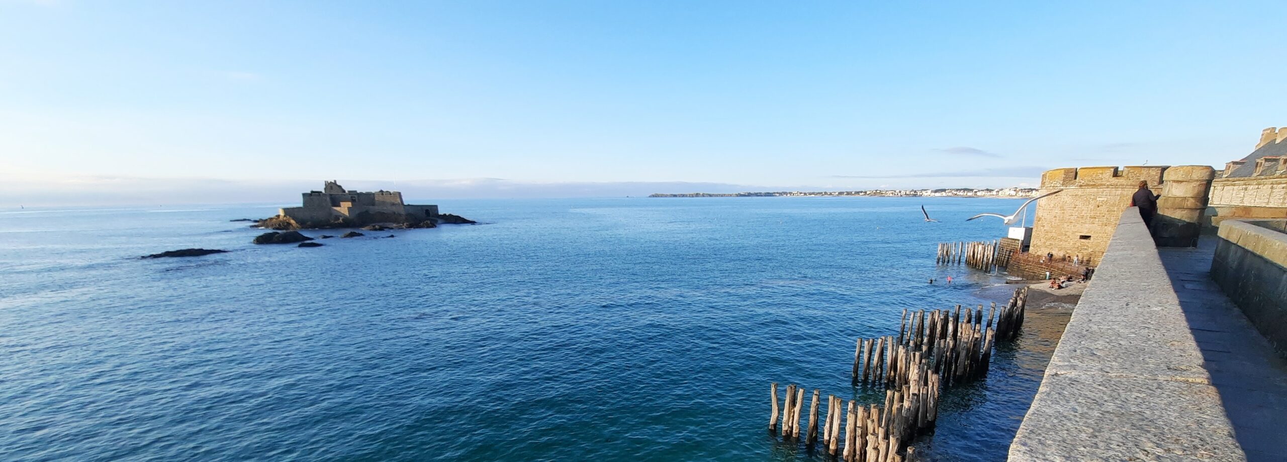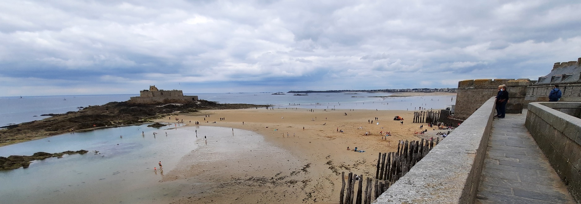 10.07.2021 | St. Malo | Bei Leichtwind segeln wir durch die Untiefen des „Plateau des Minquiers“ nach St. Malo. (36 sm) Die Einfahrt mit dem Leuchtturm ist eindrücklich. (>Bild) Zur Marina Vauban gehen wir durch eine grosse Schleuse (>Bild), um unabhängig von der Tide zu sein, die bis zu 12 m Hub (Weltrekord!) sein kann. Wir bleiben zwei Nächte und geniessen diese sensationelle Stadt. (>Ausblick auf den berühmten Stadtmauern, Bild Flut, Bild Ebbe). Ein Meilenstein auf unserer Reise! |
