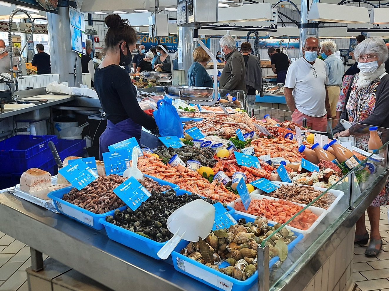 22.08.2021 | Ile d’Yeu – Port Joinville | Da wir bei Niedrigwasser noch nicht aus der Marina Pornichet auslaufen können, machen wir am Morgen im Städtchen unsere Food-Einkäufe. Frischer gehts nicht mehr: In der Frisch- und Fischhalle hat es alles, was der Bauch begehrt. (>Bild). Die 32 sm bis zur Insel d’Yeu sind ein richtiges Sonntagfährtchen bei 12-15 kn (3-4 Bf) Westwind. Endlich können wir den Sonnenschein geniessen. (>Bild). Um 19 Uhr legen wir in Port Joinville an, das wir auch nur bei Hochwasser anlaufen können: Kartentiefe 1.10 m+Tide 2.30 m ergibt abzüglich unserem Tiefgang von 2.40 m eine Reserve von einem Meter. |
