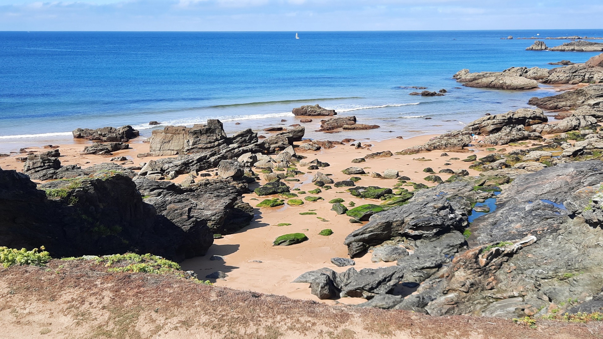 23.08.201 | Ile d’Yeu – Port Joinville | Aus einer zweistündigen morgendlichen Velotour auf dieser Atlantikinsel – Auslaufen war erst um 14 Uhr möglich – wurde eine ganztägige Tour mit so vielen Naturschönheiten und einem gemütlichen Lunch im besten Restaurant der Insel, dass wir das Auslaufen nach La Rochelle auf Dienstag verschoben. Am geschichtsträchtigen Pointe de But zum Beispiel sind etliche Dreimaster des 19. Jahrhunderts mit Mann und Maus im Nebel orientierungslos untergegangen und 1918 strandete der US Transporter „Tenadores“ mit hunderten italienischen Kriegsveteranen an Bord. (>Bild). Absolut Idyllisch sind die Badebuchten (>Bild), sowie die vielen in den Pinien versteckten Urlaubshäuser, vor denen unglaublich oft ein uralter Renault 4 steht. (>Bild) |