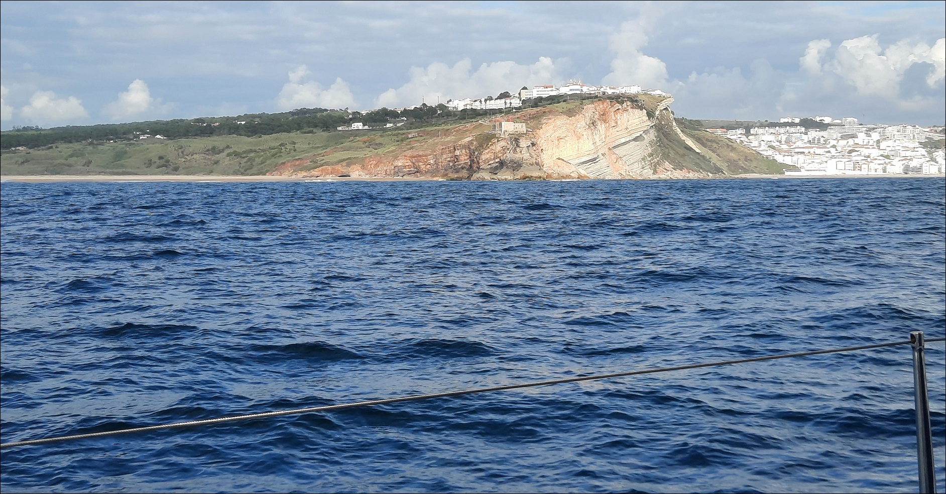 25.09.2021 | Nazaré | Heute können wir endlich mal segeln. Wir kreuzen 25 sm bei schönem regelmässigen Südwind um 15 kn und Sonnenschein, müssen aber dann die Segel streichen, da wir sonst Nazaré nicht vor Sonnenuntergang erreichen. Die berühmte Surfecke eine Meile vor dem Hafen, wo sich sonst die weltweit grössten Wellen (bis zu 30 m!) wegen einer Bodenanomalie aufbauen, sieht heute absolut unspektakulär aus (>Bild); zum Leidwesen unserer Crew und Surfer Adi, der nur allzu gerne ein Spektakel gesehen hätte. (>Weltrekord Garrett McNamara 2019, youtube) |