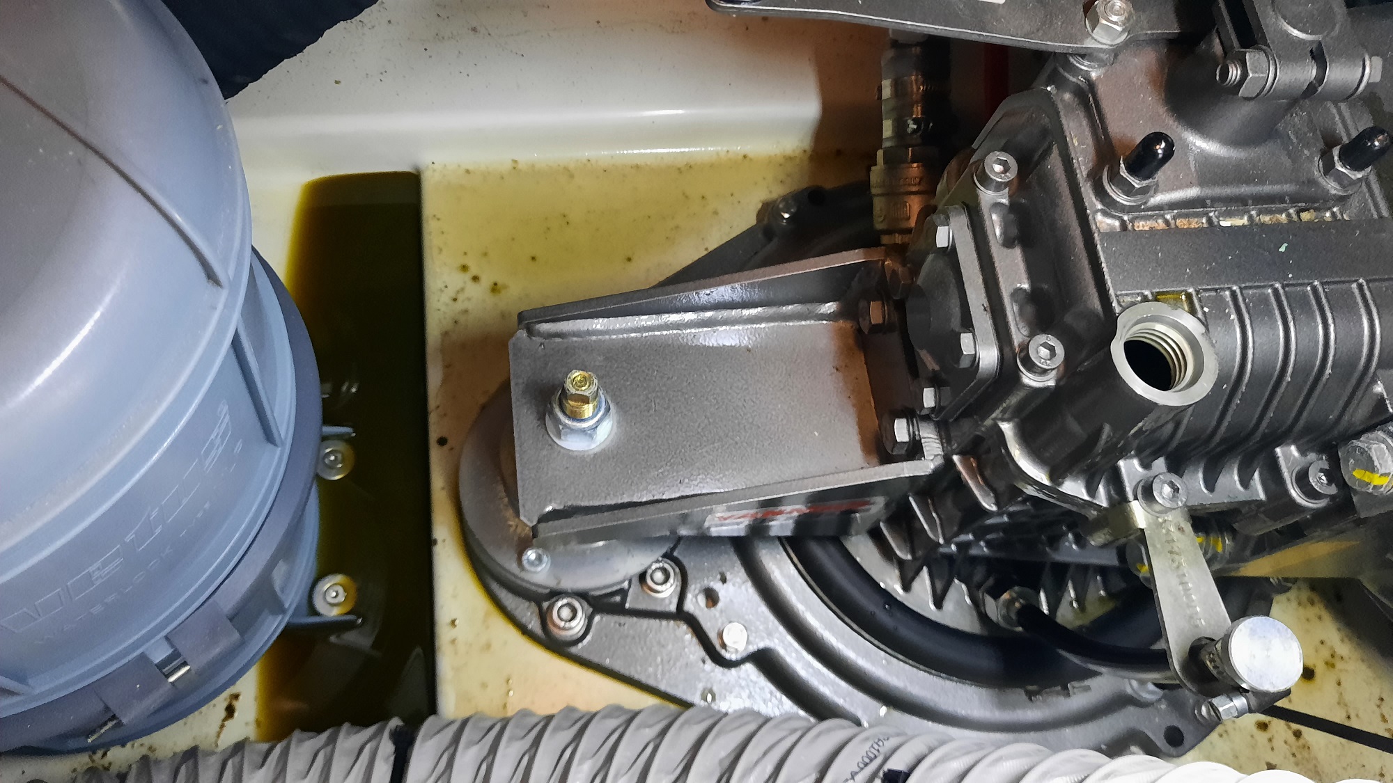 12.09.2021 | Porto Novo | Heute segeln wir zum ersten Mal mit Patrick und Thierry raus aus der Ria bis nach Porto Novo (15 m). Sie lernen das Schiff kennen und wir können sogar zwei Stunden segeln bei 1-2 Bf. (>Bild) Bei der Kontrolle des Ölstandes im Getriebe machen wir eine üble Entdeckung (s. Bild): Der Saildrive hat ein Leck. Wir müssen morgen den Yanmar-Spezialist an Bord kommen lassen. |