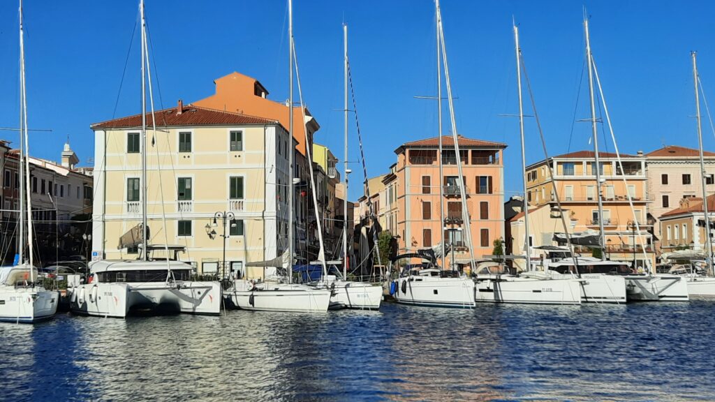 Und dann ging es am Samstag wieder los! Die Windprognosen waren sehr unbeständig und so präsentierte sich auch das Wetter. Es hatte in den letzten Tage einige Mal geregnet und überzog die Sarabella mit einem Schmutzfilm von Saharastaub. Bewölkung und sogar drohende Gewitterwolken waren wir uns von Griechenland her nicht gewohnt! Auch der Wind wechselte von Flaute bis zu Sturmstärke und dies besonders, als wir die schmale Passagio di Fornelli durchfahren mussten.