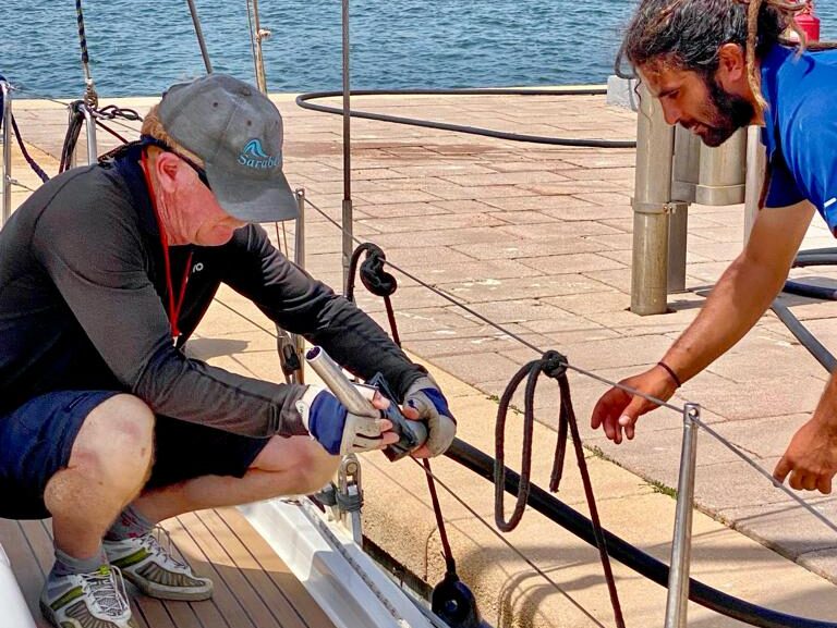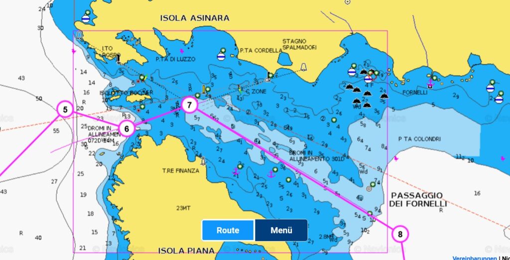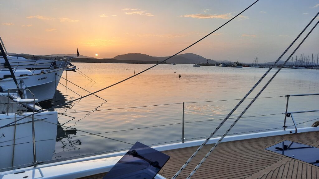 Bei 23 Knoten Wind mussten wir auf fünf Grad genau steuern die Peilmarken anfahren um nicht aufzulaufen. An der kritischsten Stelle zeigte der Tiefenanzeiger lediglich einen Meter unter dem Kiel an! Die Stecke für die letzten Meilen bis zur Marina Stintino verlief quer zur Welle und wir mussten uns alle einpicken um nicht herum geworfen zu werden. „Das war ein sehr aufregender erster Segeltag“, meinte die Crew und bewunderte unsere Ruhe bei den kritischen Manövern.