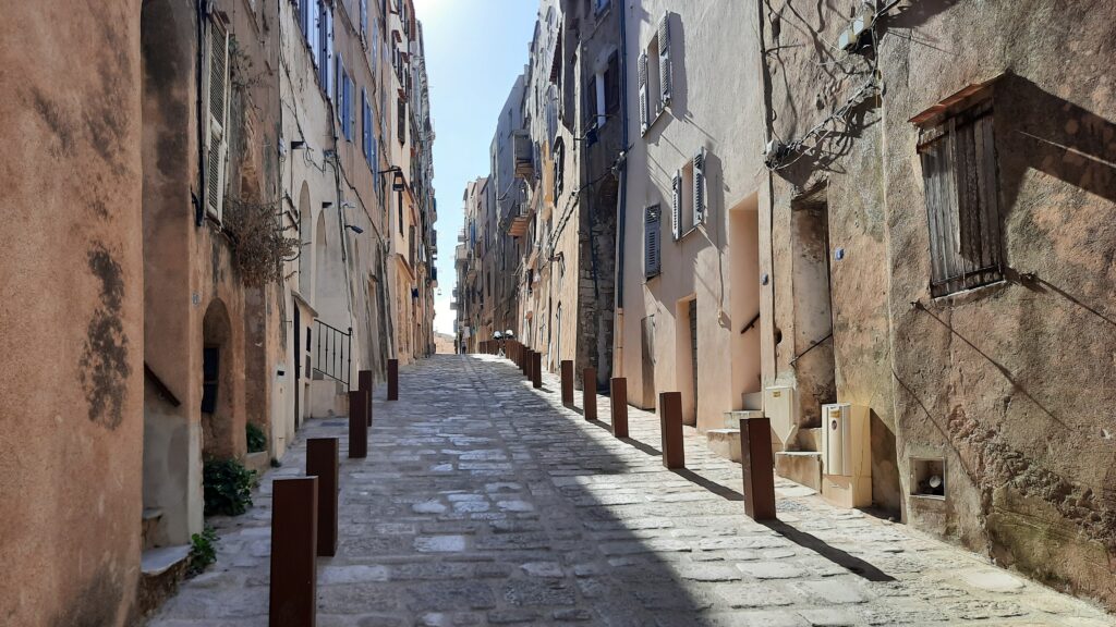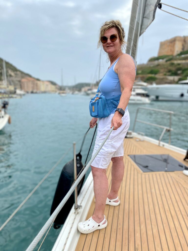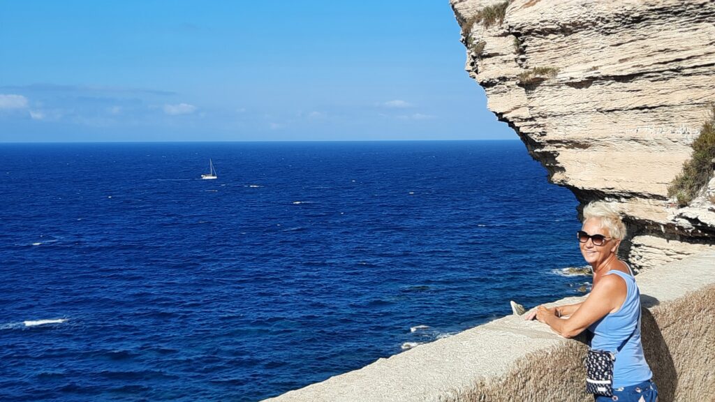 Der Höhepunkt dieser Segelwoche sollte der Besuch von Bonifacio auf Korsika sein. Aber auch dieses Abenteuer mussten wir uns verdienen. Zuerst war die kurze Überfahrt geprägt von Böen und diesigem Wetter, so dass wir die eindrucksvolle Klippen nur im Dunst sahen und zweitens herrschte vor dem Hafen ein solches Durcheinander, dass wir mehr als eine Stunde zwischen den engen Felswänden vor dem Hafen warten mussten, was bei zwanzig Booten und einer ausfahrenden Fähre nicht ganz einfach war! „Nichts für schwache Nerven“, steht im Hafenführer. Wir wurden auf die Probe gestellt. Cordula hielt tapfer Wache mit dem Fender, wenn es zu eng wurde.