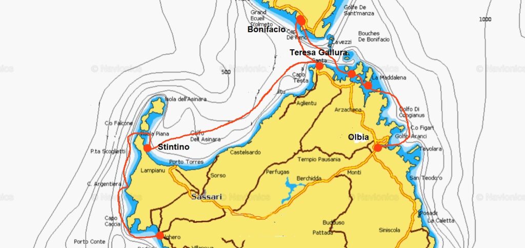 Törnstrecke: Alghero – Stintino – Teresa Gallura – Bonfacio – Maddalena – Isola Caprera – Olbia. Total 145 Meilen