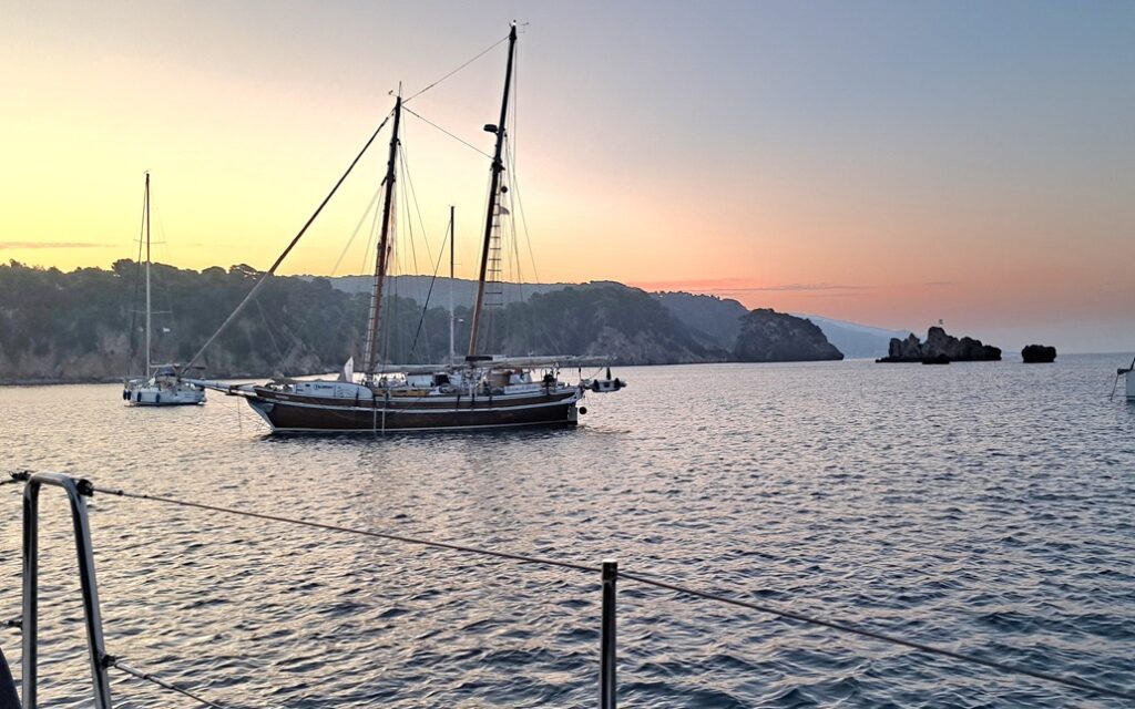 Heute machen wir Insel Hopping und motoren nach einem Badehalt nach nur elf Meilen bis zur Insel Meganisi, in die Bucht von Atherinos. Der wenige Wind aus Süd schläft nach dem Ankern ein und alle Yachten drehen in verschiedene Richtungen, was plötzlich zu wenig Abstand zu Nachbarschiffen gibt. Wir entscheiden aufzuankern und verziehen uns mit Landleinen in eine kleine Bucht nebenan. Söne macht uns ein tolles Nachtessen mit Gemüse-Parmigiana. >Rezept