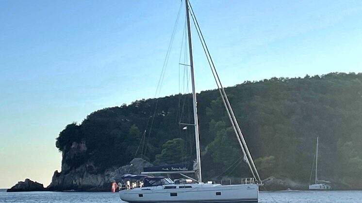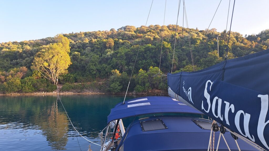 Wenn man am Morgen loslegt, ist die Chance gross, dass es keinen Wind hat. Wir überlegen auf Antipaxos in dieser „blauen Lagune“ zu ankern und zu baden, aber sie ist nach wie vor überfüllt und drehen ab. Wir motoren rüber zur elf Meilen entfernten Bucht Two Rocks Bay am Festland. Dort ist das Wasser fast genau so blau, dafür ist es ruhig. Die Fische tanzen nur so um unser Schiff herum, es sieht aus wie in einem Aquarium! Das Ankern ist ein bisschen tricky, da die Bucht zwar geschützt ist, aber die Wirbel die Boote rundherum schwojen lässt. Trotzdem setzen wir bei sieben Meter Wassertiefe 50 Meter Kette.