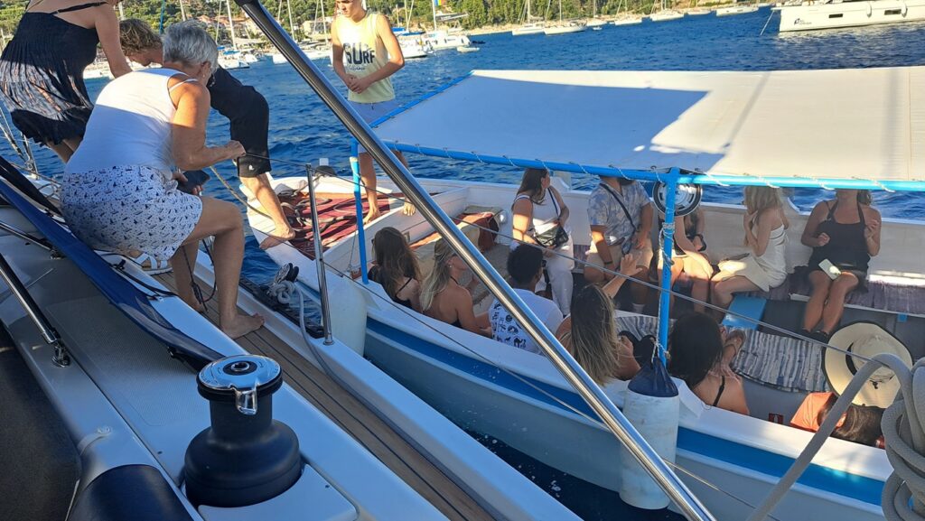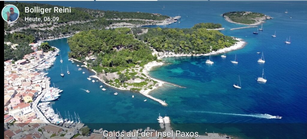 Diese Nacht war ein bisschen „rocky“. Wir haben zwar genügend Raum gehabt zum Schwojen, aber der Swell dauerte fast die ganze Nacht. Um zehn Uhr müssen wir noch im Pyjama den Anker fluchtartig heben, da wir nicht sicher sind, ob wir über die grossen Touristenboote mit ihren hundert Meter Kette geankert haben. Das Gute ist, dass wir schon am Mittag in Paxos-Gaios ankommen und einen sicheren Platz mit Mooringleine haben. Um drei Uhr ist alles schon besetzt! Es scheint mehr Yahcten als im Juli zu haben. Ob sie die Mooringkette „getroffen“ haben, wissen wir nicht, da wir am Morgen früh ablegen.