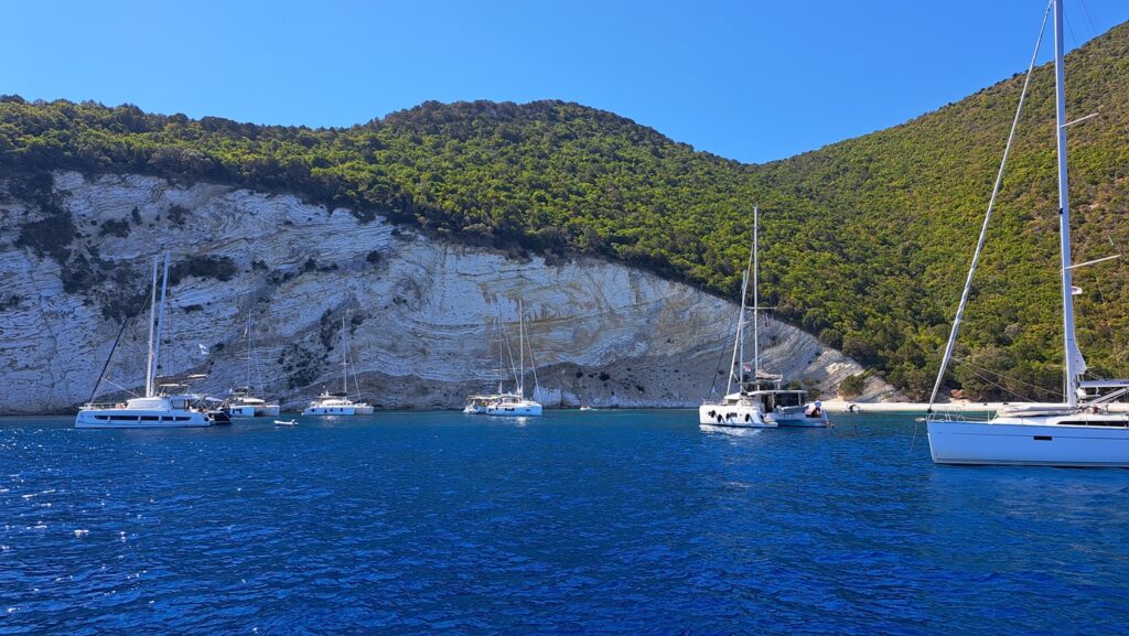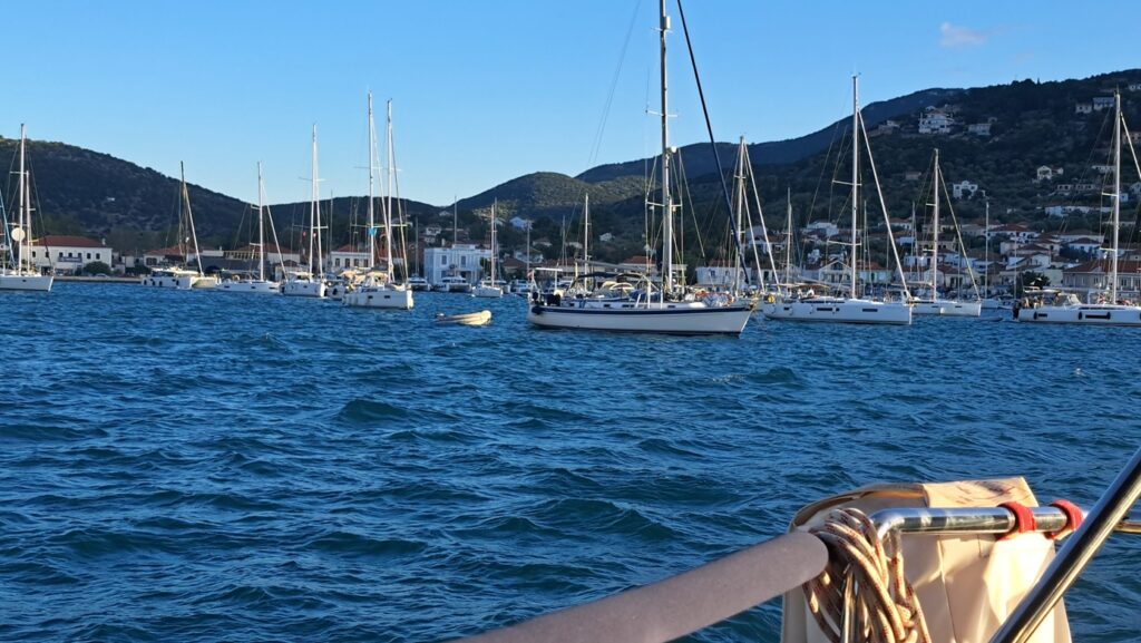 Die Prognosen stimmen wieder mal nicht. Nach dem Passieren des Kanals hat es wunderbaren Nordwind, der dann in der Mitte dieses seeartigen Gebiets zwischen Lefkas und Meganisi auf Süd dreht. Aus dem Raumwindsegeln wird ein Amwindkurs und wir machen kleine Rennen mit den Yachten, die zahlreich um uns herum nach Süden segeln. Als wir die Südspitze von Meganisi umrunden, dreht er wieder auf Nord und wir können nochmals mit leicht geschrickten Segeln auf unseren Ankerplatz in der Bucht Rementinou drei Meilen weiter oben zusteuern. Es hat genügend Platz, aber wir müssen uns neben sieben anderen Yachten zuhinderst einreihen. Nach zwei Versuchen hält der Anker und Adi bringt die Landleinen aus. Es ist sehr friedlich hier.