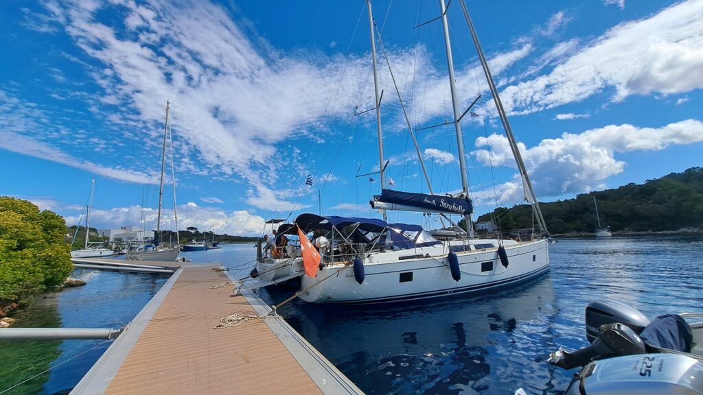 Einmal mehr sind wir froh, dass wir gut planen! Da Freitagnacht eine Störung mit viel Regen angesagt ist, haben wir in weiser Voraussicht schon vor einer Woche einen Platz am Trocolo Pier reserviert. So können wir heute gemütlich von Vathi ablegen, acht Meilen mit leichtem Ostwind Richtung Nord segeln, einen ausgedehnten Halt in der Bucht Rouda nebenan einlegen und dann gemütlich die zwei Meilen in diese gut geschützte Bucht motoren. Viola empfängt uns freundlich und hilft beim Anlegen.