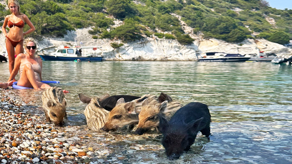 Auf dem Weg nach Poros (31 Meilen), wollen wir die Insel Atokos ansteuern. In der „One House Bay“ soll es Schweine geben, die zu den Booten schwimmen um Futter zu kriegen. (Arcudi war eine Fehlinformation). Doch es sind so viele Yachten da, dass ein Ankern unmöglich ist. Regi hat extra Äpfel gekauft, die nun wir aufessen müssen. Leider hat es auch nach dem Inselstop keinen Wind und wir müssen die 20 Meilen bis zum Hafen Poros auf Kefallonia motoren. Spiros, der legendäre Hafenmeister, weisst einem über Funk genau ein und schreit „drop your anchor now!“ In der originellen Felsenbar geniessen wir das „Ankerbier“.