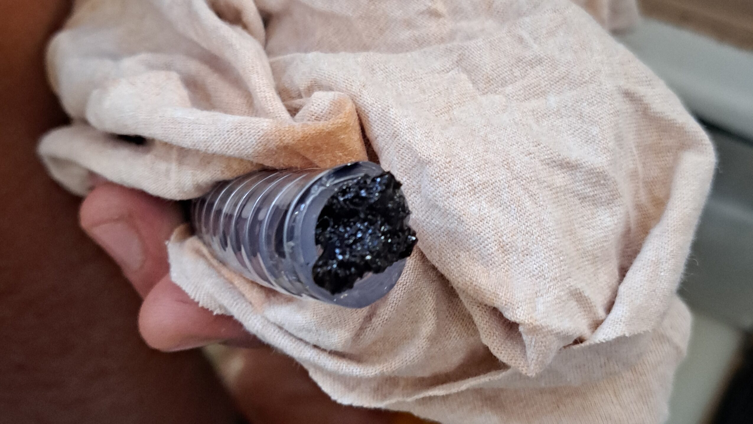 Die Mechaniker öffnen den Dieseltank, blasen die Leitungen mit Pressluft aus und finden relativ wenig Schmutz, den sie absaugen können, bis sie einen grossen Pfropfen aus Diesel und Wasser finden, der offenbar vor dem Ansaugrohr klebte. Sie wechseln noch alle Filter und dann läuft der Motor wieder tadellos.