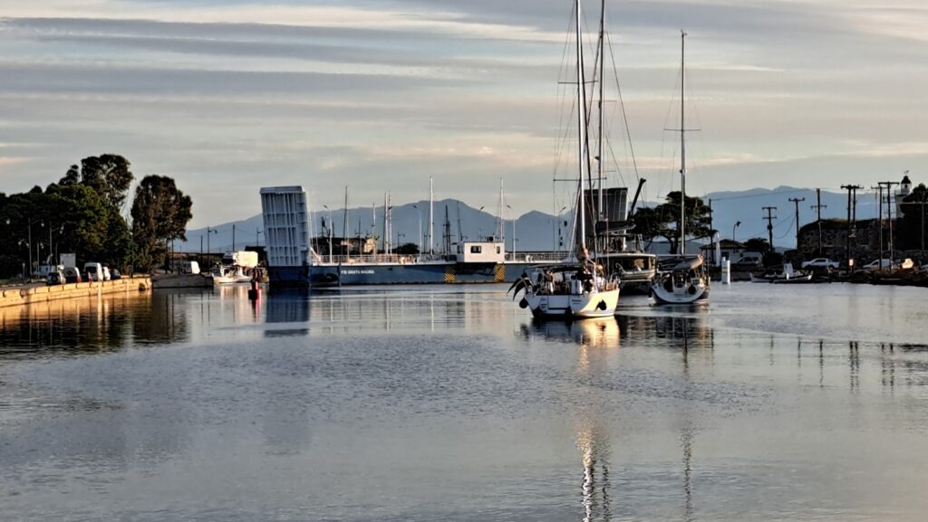 Heute wollen wir unbedingt die Lefkas Brücke passieren, damit wir die südliche ionische Inselwelt entdecken können. Wir rechnen mit sieben Stunden Segelzeit für die 47 Meilen. Am Anfang stimmt unsere Rechnung und wir kommen bei leichten Winden recht gut unter Segel voran. Nach zehn Meilne schwächelt er aber und wir müssen motoren um den Zeitplan einhalten zu können. Unglücklicherweise dreht er noch auf Nord und nimmt zwar wieder zu, aber um vor dem Wind zu kreuzen, fehlt uns die Zeit. Mit zwanzig anderen Booten passieren wir die Fährebrücke, die richtige Brücke soll nächste Woche wieder in Betrieb gehen. Kaum angelegt, spazieren wir ins Städtchen und essen bei unserem Liebilingsrestaurant „Nautilus„.