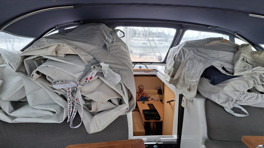 Nach einem Zwischenstopp in Syvota am Steg in der Karvouno Bay und dem letzten Bad im Meer, motoren wir die letzten zwanzig Meilen dieser Saison gemütlich „nach Hause“. Für Morgen und die weiteren Tage sind Gewitter und Regengüsse angesagt, so dass wir trotz drohenden Wolken alle Segel gleichentags trocken abschlagen können. Adi und Urs haben mächtig geholfen, sind doch die drei Segel rund 180 kg schwer!